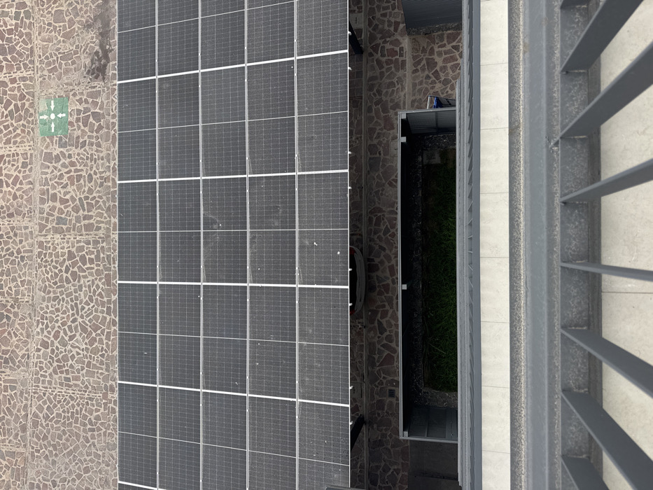 The image captures a high-angle, downward view of an urban environment in León, Mexico. In the immediate foreground, a gray metal railing with horizontal bars is partially visible. Directly below the railing, a lower-level courtyard or recessed area contains a rectangular patch of green grass, enclosed by dark-colored walls and irregular brown stone paving. A partially visible blue object, possibly a container, is situated on the right side of this lower level. Above the courtyard, an array of at least twenty dark gray photovoltaic solar panels, delineated by white grid lines and exhibiting surface dust, is installed on a rooftop or elevated platform. In the uppermost background, a ground-level area paved with irregular brown cobblestones displays a green square symbol featuring white arrows pointing outwards from a central point. No individuals or active interactions are present in the scene.