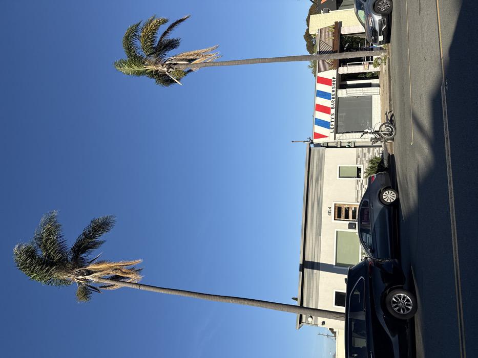 This image captures a daytime street scene at 4154 Voltaire Street, in the Point Loma neighborhood of San Diego, California, United States. The sky is clear and bright blue. Two tall palm trees with green and dried brown fronds are prominent; one stands to the left of the scene, and another to the right, both extending vertically into the upper frame. The central focus includes two commercial buildings. On the left is a single-story structure, address "4154" displayed above its recessed wooden door. This building features light gray horizontal siding on the upper portion and a textured light gray wall below, with two large, light green-tinted windows. To its right, "LEFTY'S BARBERSHOP" occupies a single-story building distinguished by a red, white, and blue striped awning or sign above its entrance, which appears to be secured by a gray roll-down gate. A small barber pole stripe is visible on the right side of the barbershop's facade. Parked curbside along the asphalt street are three vehicles: a dark-colored SUV partially obscuring the 4154 building on the left, a dark gray sedan behind it, and a silver SUV further right in front of an adjacent building. A white electric scooter is parked upright on the sidewalk directly in front of Lefty's Barbershop. Shadows from unseen objects are cast onto the street in the foreground. No individuals are present in the scene.
