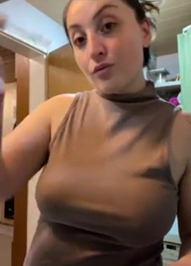 A woman is seen in a medium shot applying liquid from a dropper to her face. She is wearing a tan, sleeveless turtleneck top. Her dark hair is pulled back. She has a tattoo on her left forearm. The background shows a doorway leading to another room with wooden cabinets and some items on a shelf. A partially open closet with items visible inside is to the right of the woman. The lighting is bright.