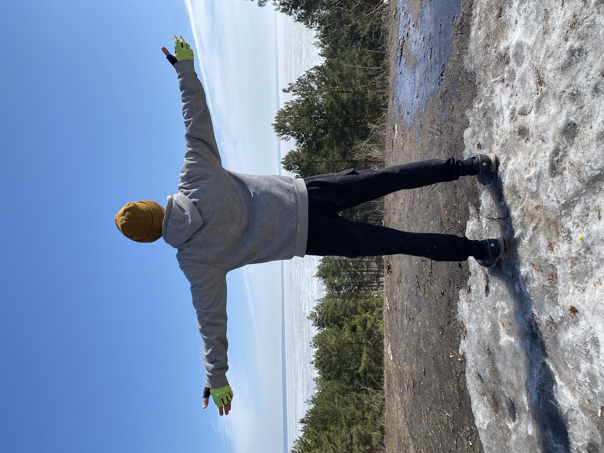 person standing on a muddy, partially snow-covered patch of land overlooking a frozen body of water. The person is wearing a grey hoodie, black pants, dark-colored shoes, a brown hat, and light green gloves. Their arms are outstretched, forming a "T" shape. Behind the person is a line of trees, and beyond that, the frozen water extends to the horizon, where it meets the sky. The sky is blue with streaks of white clouds. The location is Ulyanovsk, Russia.