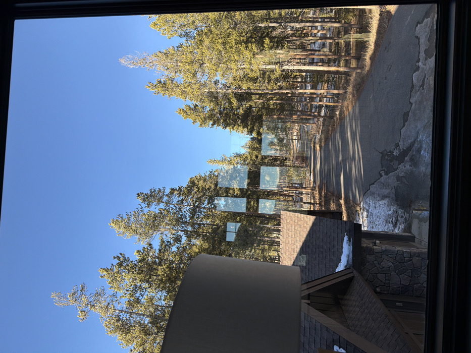 From a window's perspective, a clear blue sky meets a line of evergreen trees. A road runs alongside the trees, partly covered in shadows and patches of snow. Below the trees, a roofline with snow accumulation is visible. Reflections on the window break the view into fragmented squares. An indistinct object obscures the bottom left portion of the scene.