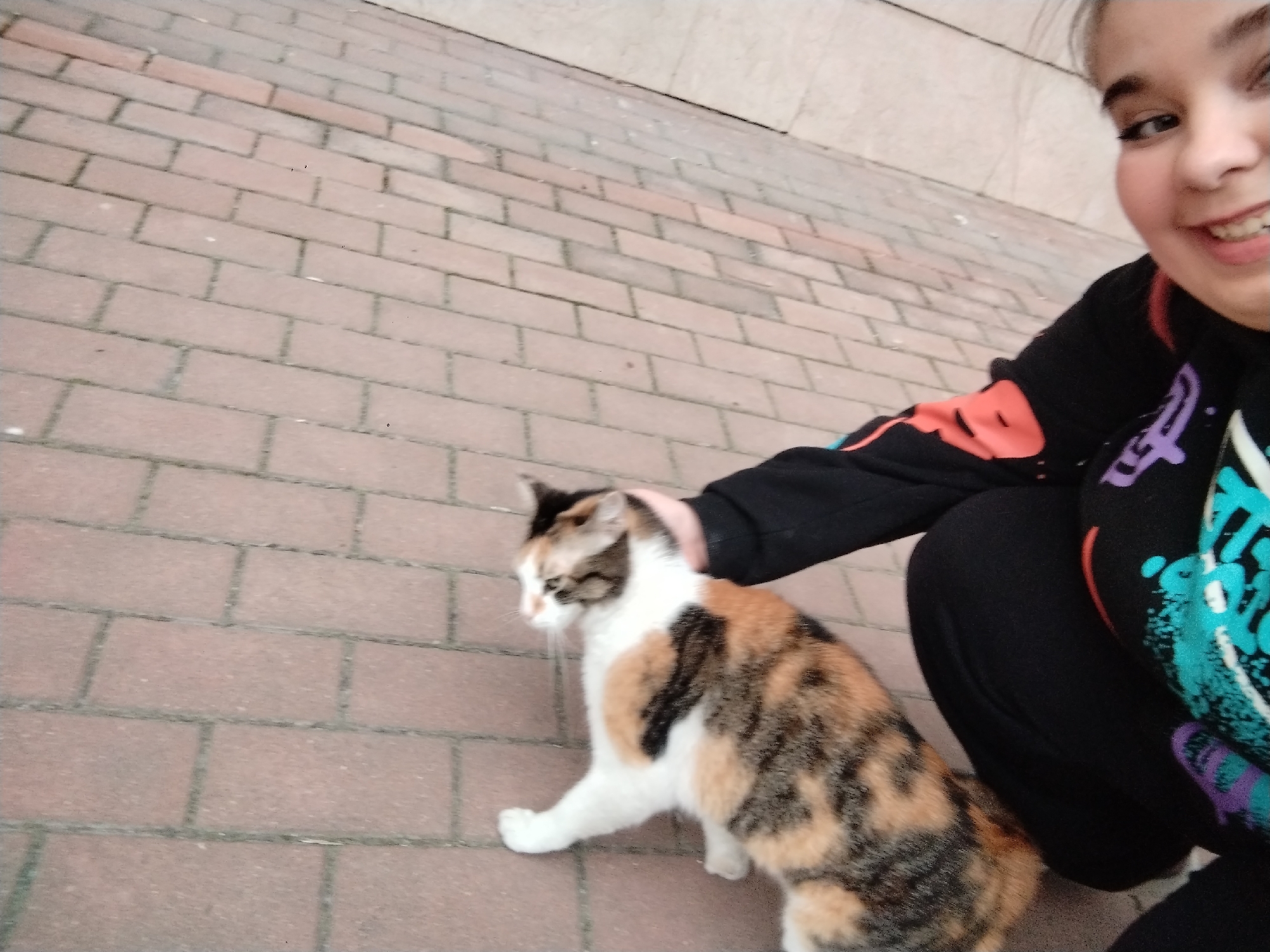 A girl smiles, crouching on a red brick sidewalk in Plovdiv, Bulgaria, while petting a calico cat. The cat is white, orange and black. The girl is wearing a black sweater with neon patterns.