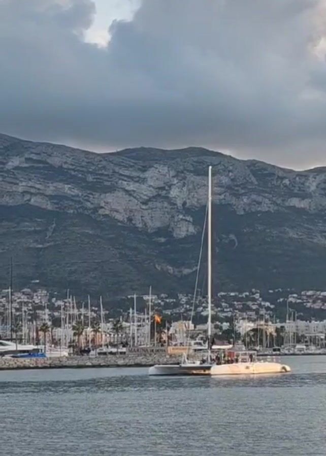 catamaran sailing on a body of water. In the background, a mountain range looms behind a marina filled with sailboats and a coastal town. The sky is filled with clouds, suggesting it could be early morning or late afternoon. The catamaran appears to be moving steadily through the water, its sails not visible. A small flag is seen on one of the masts of the sailboats in the marina.