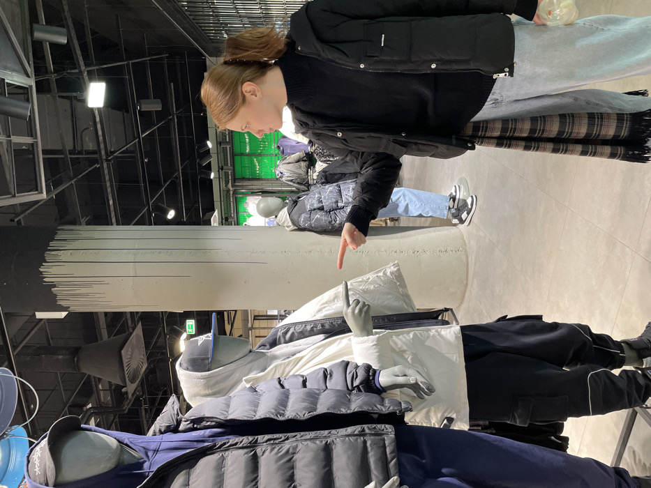 A woman points downward at a mannequin wearing a white puffy jacket. Above the mannequin is another mannequin with a jacket, jeans, and black and white sneakers. Behind the woman is a plaid scarf. The scene is in a store with a tall, cylindrical pillar with black paint at the top. The store's ceiling shows lighting fixtures and other equipment.