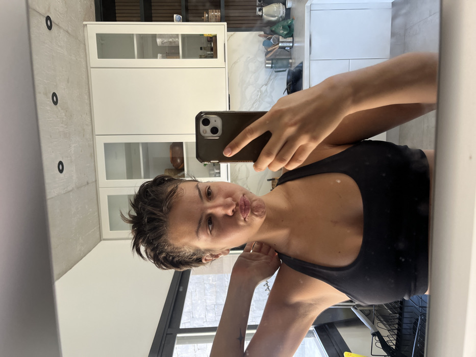A female individual is depicted in a mirror selfie, captured within a modern kitchen setting in La Barra, Uruguay. The subject has short, dark, spiky hair, appearing damp. She wears a black sports bra. Her right hand holds a dark-colored smartphone with a multi-lens camera array, positioned to photograph her reflection. Her left arm is raised, with the hand resting behind her neck. The individual's lips are pursed into a puckered expression. The reflected environment is a kitchen featuring white upper cabinets, some with glass-fronted doors, and a light-colored countertop with a white marble-patterned backsplash. A dark-framed window on the left side of the reflection reveals an exterior wall composed of light-colored, possibly stone or concrete, blocks. The ceiling is exposed concrete with three visible black-rimmed recessed lights. Kitchen objects visible on the countertop include a metallic kettle, utensils in a holder, and various containers. To the far right, a vertical section of dark, slatted open shelving is partially visible.