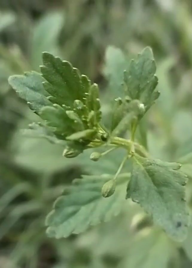 A close-up shot focuses on a green plant with leaves that have serrated edges. Small, round, unopened buds are also visible amongst the leaves. The background is blurred, showing other green vegetation. The lighting appears natural, suggesting an outdoor setting. There are no people present.