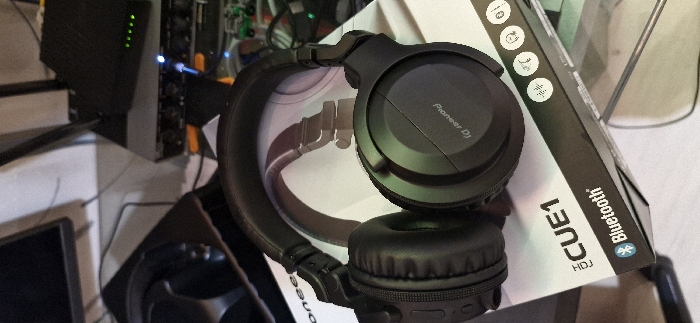 The scene is depicted indoors, within a private or commercial setting in Ust-Ilimsk, Russia, as specified. The primary subject is a pair of black Pioneer DJ HDJ-CUE1 Bluetooth headphones, resting on their corresponding retail packaging box. The headphones are unfolded, with the right earcup featuring the "Pioneer DJ" logo visible. The left earcup displays external controls. The white and black packaging box clearly identifies the model "HDJ CUE1" and prominently displays the "Bluetooth" logo, along with graphical icons representing features such as sound output, microphone, speaker, and mobile connectivity. A stylized illustration of headphones is visible on the box surface beneath the actual headphones. The background suggests a workstation or desk environment. To the upper left, a section of a black computer monitor or screen is partially visible. In the upper right, a black electronic device, likely a network switch or audio mixer, displays a row of five illuminated green indicator lights and a single blue indicator light adjacent to a connected cable. A second, smaller black electronic unit is stacked directly on top of this device. Multiple black cables are visible trailing behind and around the primary subject. Below the electronic devices, several indistinct small objects, including what appears to be a green miniature vehicle, are present. The supporting surface for these items is light-colored. No individuals are present, and no actions or interactions are depicted.