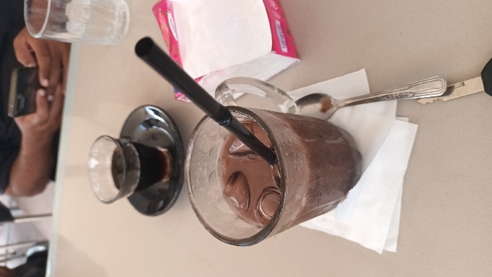 - "A table displays a glass of iced chocolate with a black straw, resting on a white napkin beside a spoon and car keys" by FM-O6sHh1, licensed under CC BY 4.0