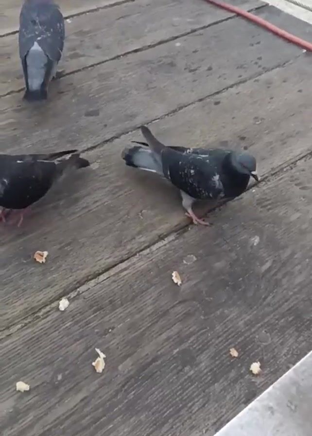several pigeons on a wooden boardwalk. The boardwalk appears to be near a beach, as the ocean and people can be seen in the background. The pigeons are scattered around pieces of food, and one pigeon flies away. The boardwalk has a white railing and a red border. There is sound in the background, but the content of the speech is difficult to ascertain.