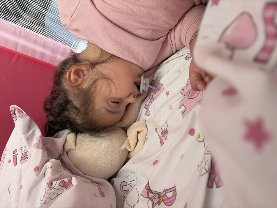 A young child with dark, wavy hair is depicted sleeping deeply on their side