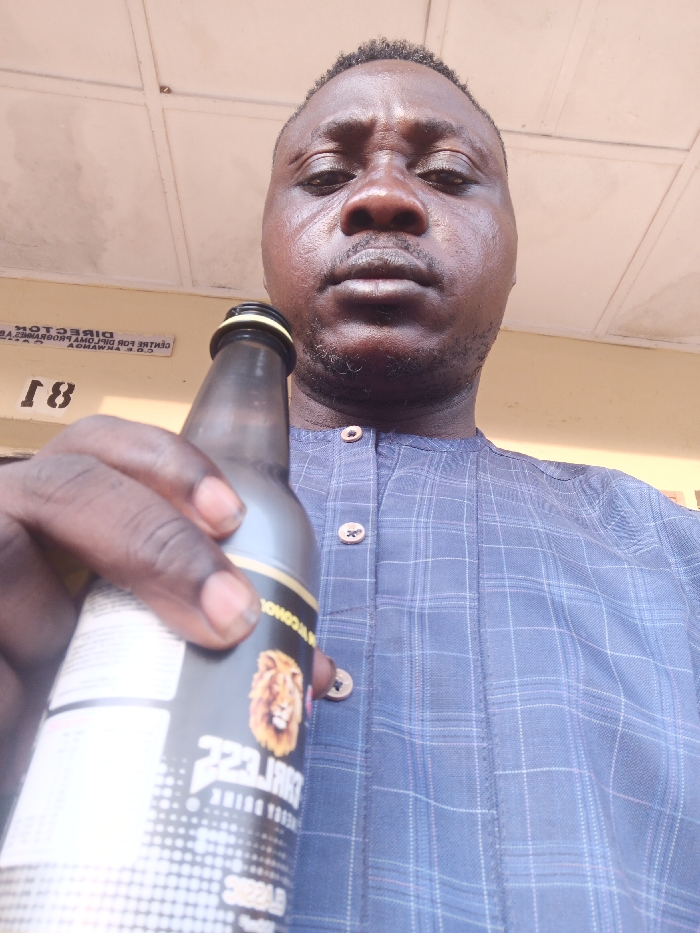 An African man holds an energy drink in his hand, with a lion logo visible on the label