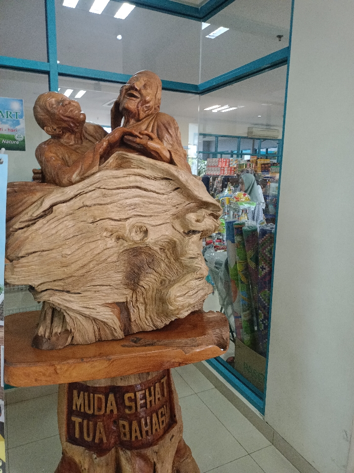 This image, captured indoors in Margorejo, Indonesia, centers on a wooden sculpture positioned in front of a glass partition