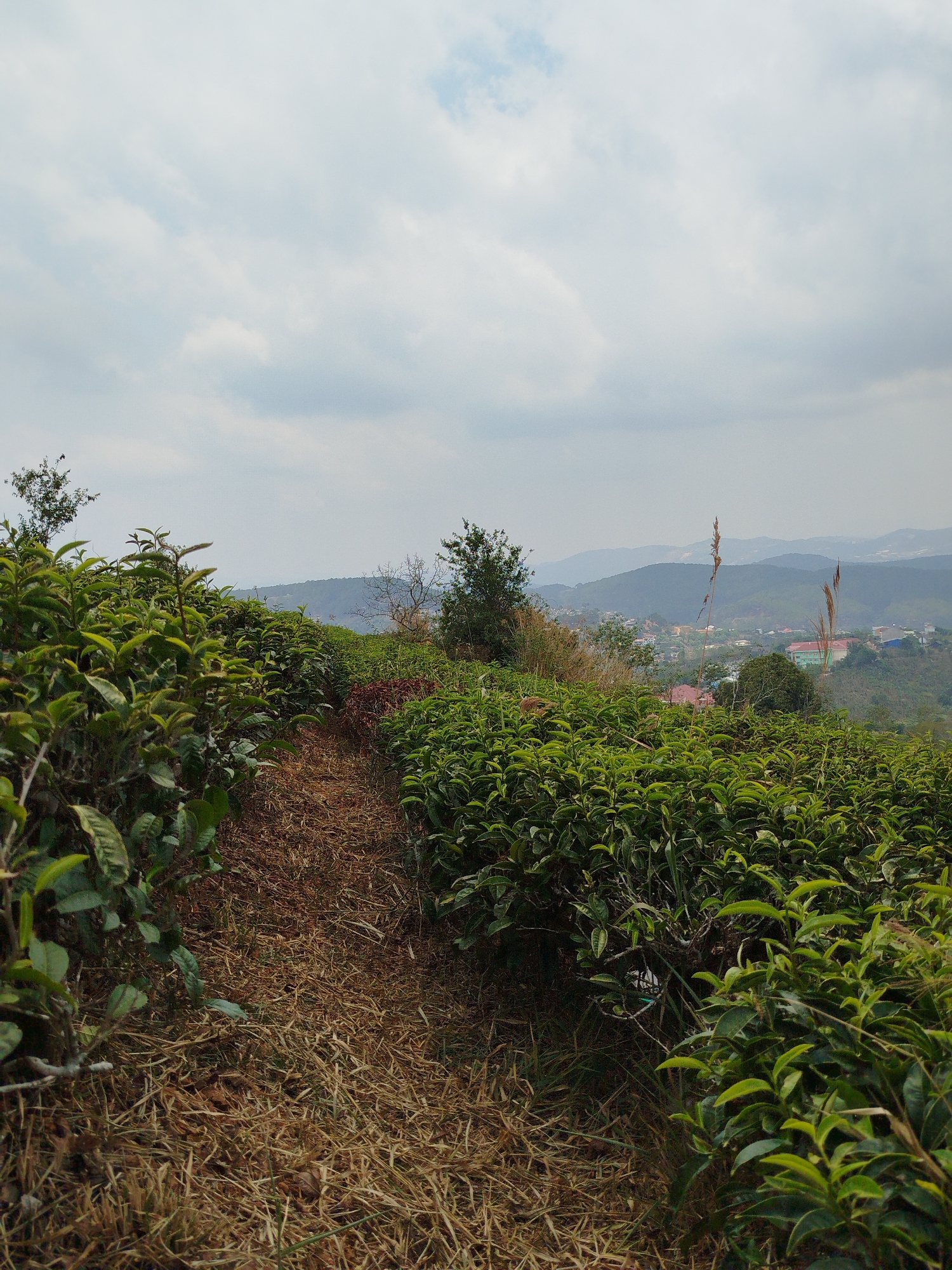 The image depicts a path running through a tea plantation in Trường Thọ, Vietnam. The path is covered in dry grass and dirt, bordered by rows of tea bushes on either side. In the background, rolling hills and a small town are visible under an overcast sky. No people are visible in the image.