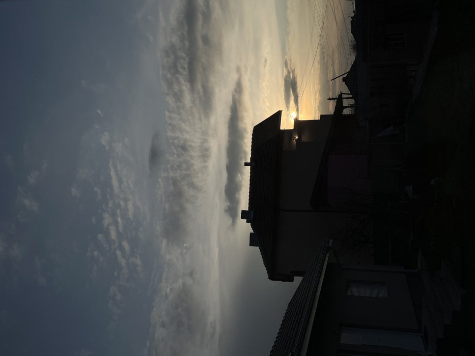 The image depicts a residential scene in Marten, Bulgaria, at sunset or dusk. The sun is low on the horizon, positioned behind and to the right of a prominent multi-story residential building, creating a strong silhouette effect across the entire foreground and midground. The sky above is overcast, with layers of dark and light clouds transitioning from a deep grey-blue at the top to an orange-yellow glow near the horizon where the sun is partially visible. A faint contrail is present in the upper left portion of the sky. In the midground, a large, dark-silhouetted building with a tiled, sloped roof and two visible chimneys dominates the center and right. The setting sun illuminates a small portion of its right side and appears to shine through a window opening or recessed area, creating a bright orange highlight. Small, dark, indistinct shapes that may be birds are discernible in the bright area near the sun-lit section of this building. To the left, a smaller, single-story building with a light-colored façade and a tiled roof is also silhouetted, showing a window with blinds. The ground area in the immediate foreground is dark and indistinct, appearing as a shadowy yard or garden, partially enclosed by a dark fence or wall. Utility lines are visible stretching diagonally across the sky on the far right. No individuals are visible.