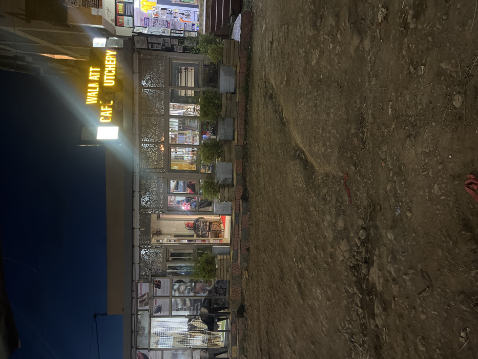 The image displays a nighttime scene in Gitothua ward, Kenya, featuring the exterior of a commercial building and its immediate unpaved foreground. The building is a single-story establishment, prominently identified by a brightly illuminated sign bearing the text "WALA ATT CAFE BUTCHERY." The facade is characterized by large glass windows and an entrance door, topped with decorative metallic panels. A raised, paved step runs along the building's front, upon which a line of six wooden planters containing small green plants is arranged. Two black plastic chairs are situated outside to the left of the main entrance. Through the glass, several individuals are visible within the artificially lit interior, including one person in a red garment seated at a table. An adjacent commercial storefront with various posters is partially visible to the right. The foreground consists of an uneven, unpaved dirt and gravel surface, exhibiting minor ruts and scattered debris, including a piece of red fabric. The sky above is dark blue.