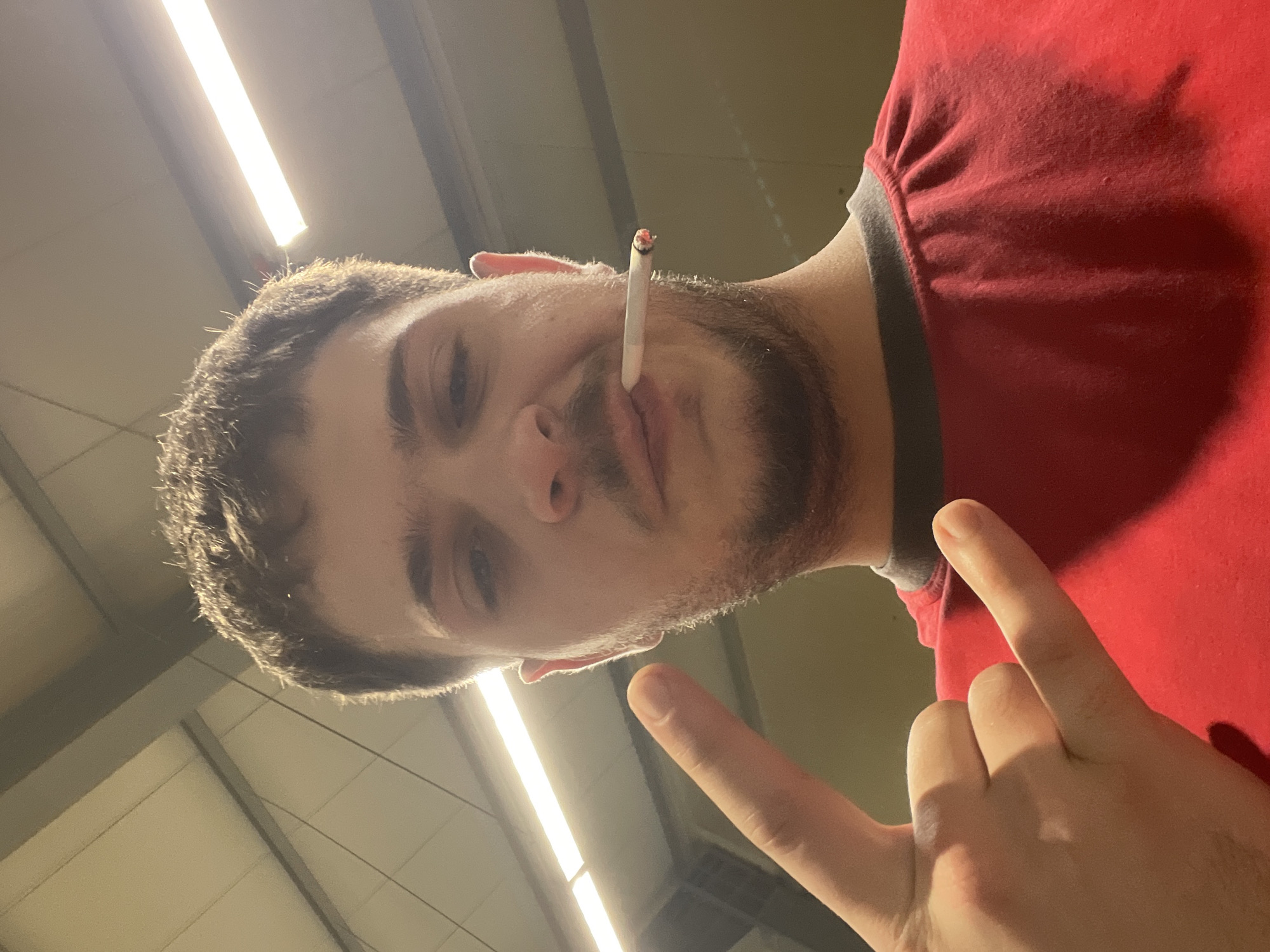 person with short, dark, curly hair and a beard. The person is holding a lit cigarette in their mouth and making a "peace" sign with their hand. The person is wearing a red t-shirt with gray trim. The background appears to be a building interior with fluorescent lighting. The exact location in Lyaskovets, Bulgaria cannot be determined.