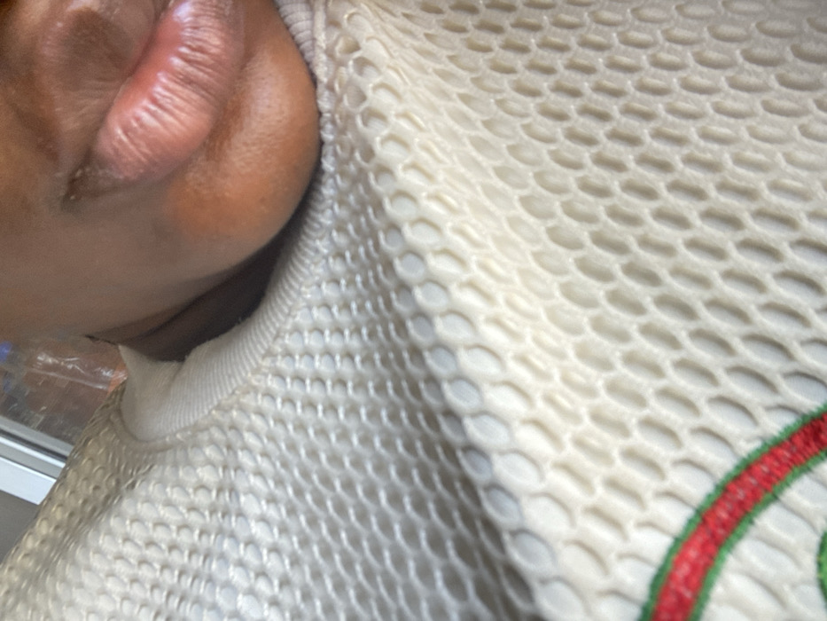 An individual with dark skin is depicted, with the lower portion of their face, specifically the chin and full lips, prominent in the upper right quadrant of the image