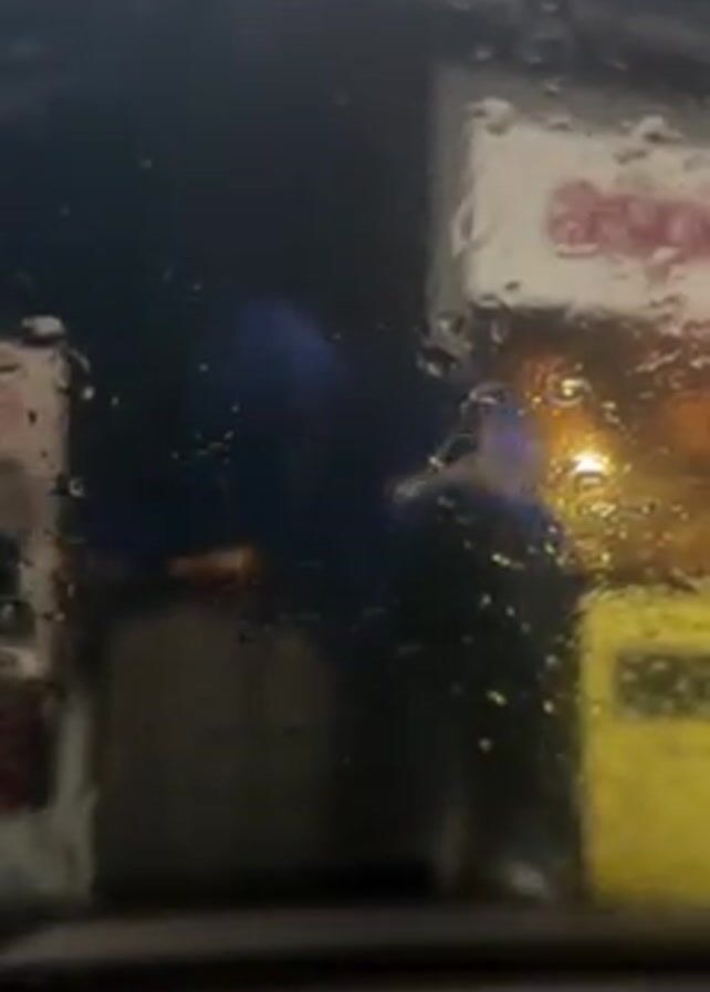A person wearing a blue hooded jacket is visible through a rain-streaked car window. They are seen pushing a yellow object, possibly a trash can, back into place. The scene appears to be at night, near a store or building with a sign, under an overhang. The visibility is obscured by the rain on the car window.