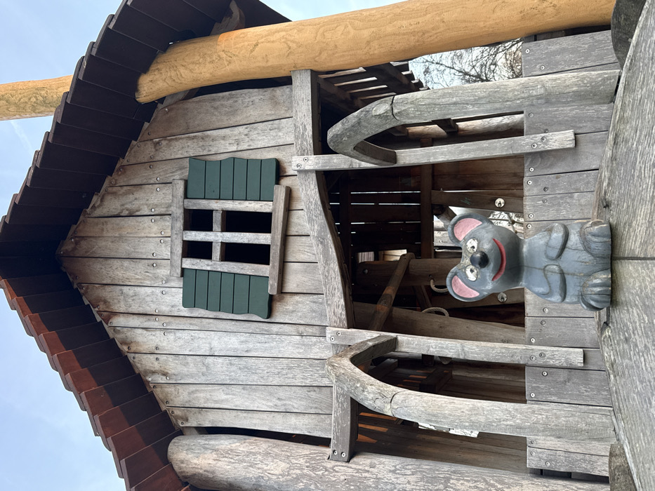 The image displays a weathered, multi-level wooden structure, situated in Olingen, Luxembourg. The main facade is constructed from vertical grey wooden planks, secured with visible fasteners, and capped by a dark brown shingled roof. Centered on the upper portion of the facade is a rectangular window featuring two horizontal mullions and two green, outwardly angled shutters. Directly below this window, on a flat wooden platform, a carved wooden figure of a mouse is positioned. The mouse is painted grey with pink inner ears, white eyes, a black nose, and a red smiling mouth. The structure is supported by several large, unrefined wooden beams, including a prominent light yellowish-orange log on the right side that extends from the lower platform towards the roofline. The background features a clear sky and distant, bare tree branches visible through the structure's framework. No individuals or discernible actions are present within the frame.