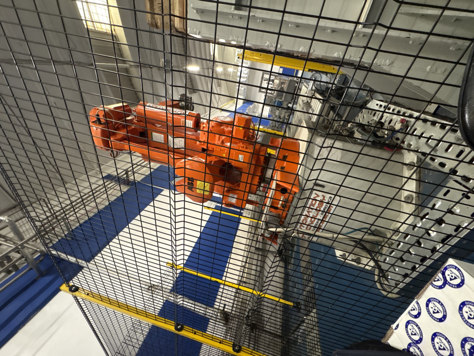 The image displays an interior industrial scene, specifically within an "AUTOMATION TECHNOLOGY Sofia - ROBOTICS" facility located in Sofia, Bulgaria. The central subject is a large, orange, multi-jointed industrial robotic arm, manufactured by ABB, which appears to be in a stationary state. This robot is enclosed within a black wire mesh safety fence, reinforced by yellow vertical posts. The robot rests on a light grey cylindrical base, which bears the text "AUTOMATION TECHNOLOGY Sofia - ROBOTICS". The surrounding environment consists of white walls featuring horizontal blue stripes, a high ceiling with visible overhead infrastructure, and a light blue floor. In the lower left foreground, a portion of a white cardboard box is visible, adorned with repeating blue circular logos depicting a cat head and the text "WHAT'S GOOD". No individuals are present, and no active operations or interactions are depicted.