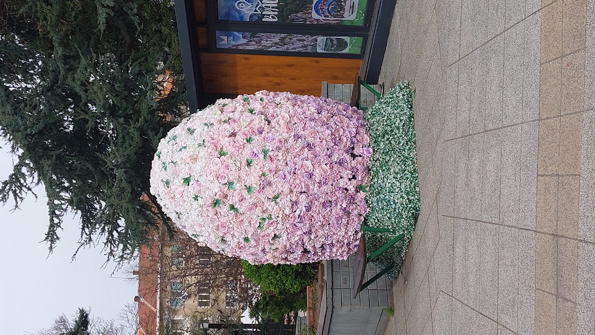 large, spherical floral display in Vratsa, Bulgaria, situated next to a building with promotional window stickers of a landmark in Vratsa