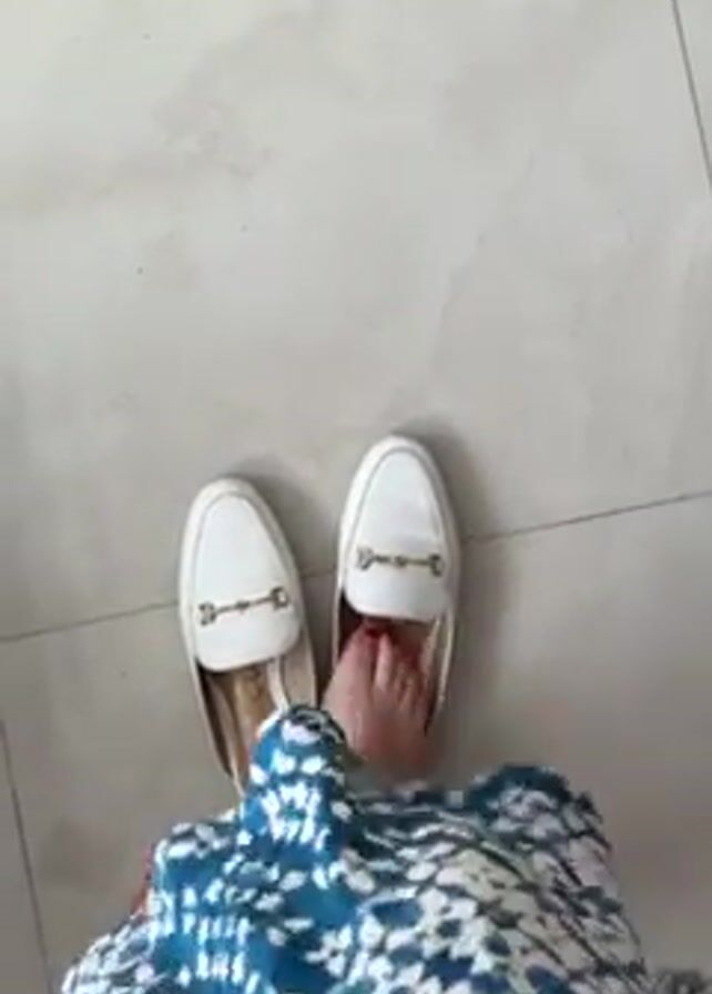 - "A woman with painted red toenails puts on a pair of white Sam Edelman mules with gold horsebit hardware" by FM-avfjN2, licensed under CC BY 4.0