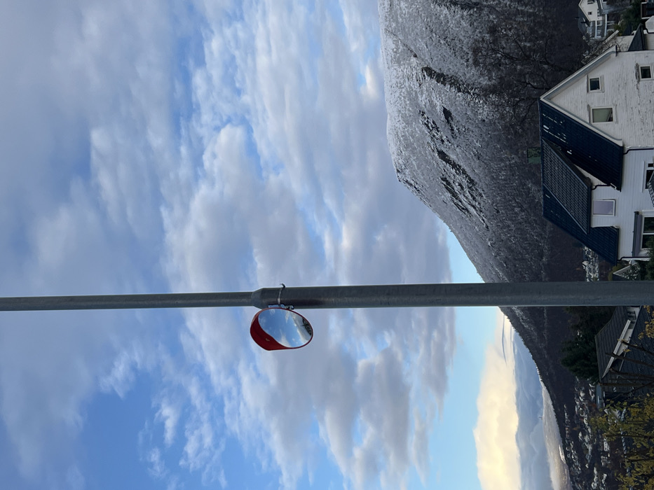 The image depicts an outdoor urban-natural scene in Tromsø, Norway, under a partially cloudy blue sky. A tall, grey metallic utility pole stands prominently in the foreground, slightly left of the image's vertical center. Attached to this pole, approximately halfway up, is a circular convex mirror featuring a bright red rim. The mirror's reflective surface displays a distorted view of the blue sky and scattered white clouds. In the midground, below the mirror and to the right of the pole, a white two-story residential house with a dark, multi-gabled roof is visible. Patches of snow or frost are present on sections of the roof. To the left of this house, another building with a dark roof is partially obscured. Further into the midground, a residential area with numerous houses and some trees extends into a valley or fjord on the left side, partially covered by low-lying clouds or mist in the distance. The background is dominated by a large, snow-dusted mountain that occupies the right side of the frame. Its slopes show dark, rocky terrain interspersed with snow cover and sparse vegetation, likely trees. The overall environment suggests cold weather conditions, indicated by the visible snow on the mountain and rooftops. No individuals are present in the scene, and no specific actions or interactions are depicted.