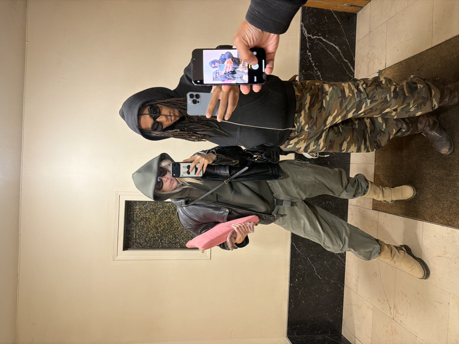 An interior scene in the city of Paris, France, features three individuals involved in a photographic interaction. Two individuals stand centrally, facing the viewer, while a third is partially visible on the right. The individual on the left, appearing female, wears an olive-green hooded sweatshirt beneath a black leather jacket, olive-green baggy cargo pants, and tan boots. Dark sunglasses obscure her eyes, and light hair is visible under her hood. She holds a pink, soft, rectangular object in her left arm and a white-cased smartphone in her raised right hand, directed towards the viewer. The individual in the center-right, appearing male, wears a black zippered hooded sweatshirt with visible dreadlocks, dark sunglasses, camouflage cargo pants, and dark boots. He holds a light-colored smartphone in his raised right hand, also directed towards the viewer. A third individual's right hand and forearm are visible on the far right, holding a black smartphone that displays a live camera feed of the other two subjects, indicating an active photo capture. The environment consists of light-colored walls with a dark marble baseboard running along the bottom. The floor is covered with light-toned tiles near the left subject and a dark brown or black floor mat beneath the center and right subjects. A recessed rectangular panel with a dark, textured insert is visible in the left wall. The area is illuminated by artificial light.