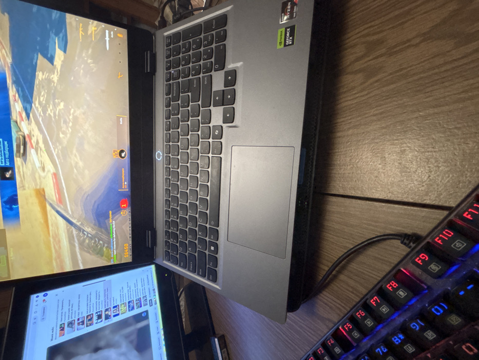 A gaming setup is observed on a wooden surface within Berkovitsa, Bulgaria. A grey/silver laptop, identified by "NVIDIA GEFORCE RTX" and "AMD RYZEN" stickers, is positioned centrally, resting on a black cooling pad with blue accents. The laptop's screen displays a video game interface, featuring in-game elements such as currency ($6450), a numeric indicator "1," and weapon icons (a knife and a rifle). To the left of the laptop, a black secondary monitor presents a web browser, showcasing video thumbnails and titles, some in Cyrillic, under a tab labeled "Моят уики" (My wiki). Partially visible in the lower-left foreground is a black external mechanical keyboard with red and blue backlighting, connected by a black cable. The wooden surface exhibits a distinct grain pattern. No individuals are present in the scene.