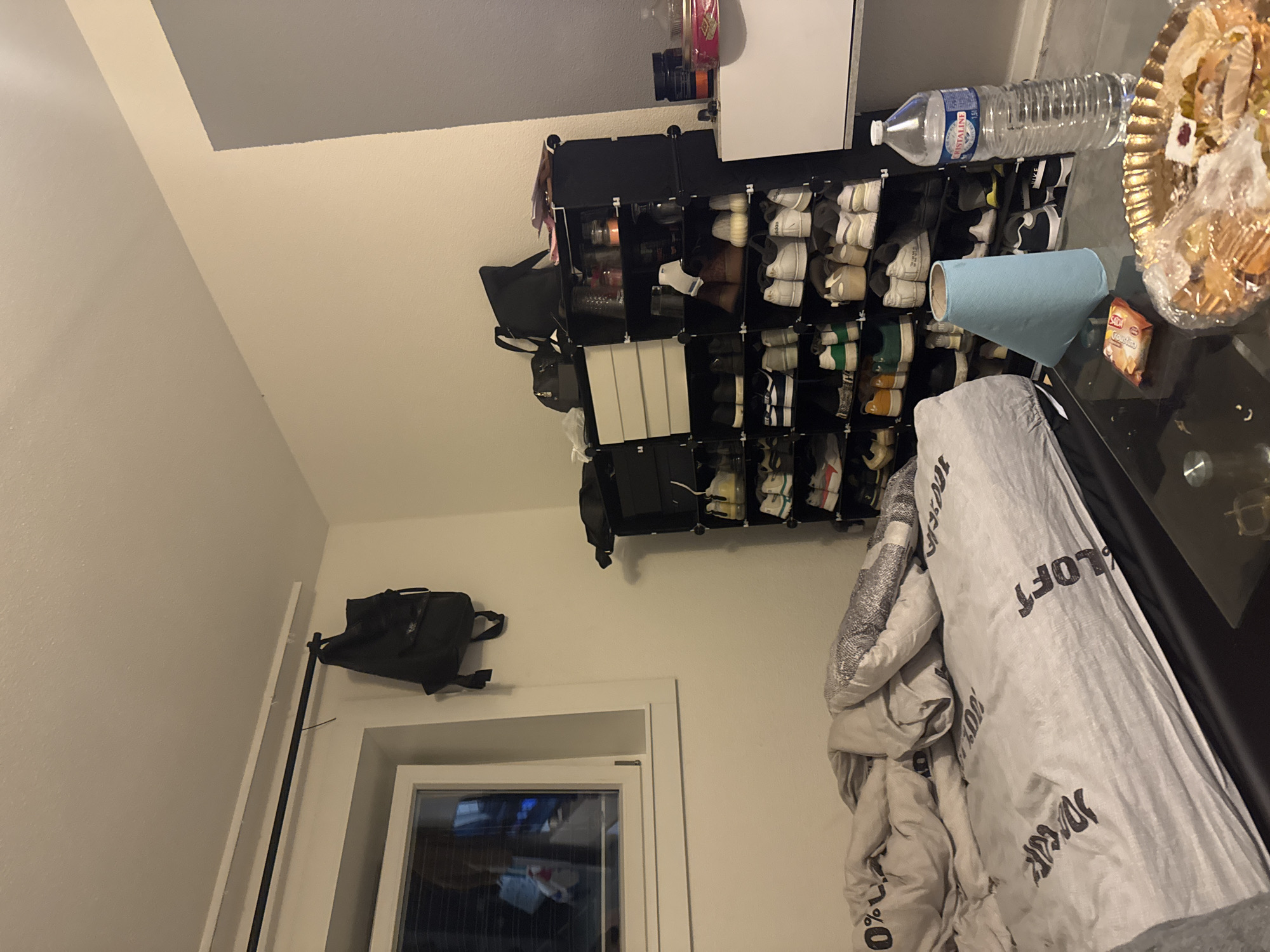 The image displays an interior room. An unmade bed with gray bedding, bearing text including "DUCAL" and "LOFT," occupies the left foreground. Above the bed, a white-framed window with internal blinds shows a reflection of an individual holding a white object with red accents. A black backpack hangs from a black curtain rod positioned above the window. The room's walls are light cream, transitioning to a gray painted section on the right side. In the center-right, multiple stacked black modular shoe racks are filled with assorted footwear, primarily sneakers. The top units of these racks contain black bags, white boxes, papers, and various small containers. A glass-top table in the foreground holds a blue conical object, a 1.5-liter Cristaline brand water bottle, a packaged snack with orange wrapping, and a gold-colored tray containing partially consumed pastries and food items. No individuals are directly visible in the room. Location: Unknown, Unknown.
