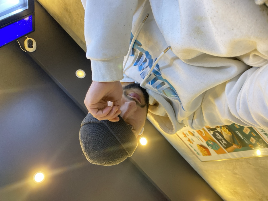 A person wearing a gray beanie and a white hooded sweatshirt faces the camera from a low angle. The background includes a black wall with a television and a security camera, along with recessed lighting. Part of a menu or promotional poster is visible, showing images of food items. The overall scene appears to be taken inside a restaurant or similar establishment.