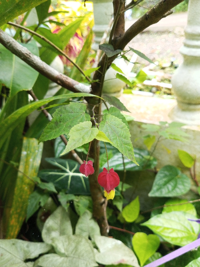 Two red and yellow flowers hang from a small tree with green leaves. Lush greenery surrounds the tree, including leaves with white veins and heart-shaped leaves. In the background, a white stone balustrade is partially visible amidst the foliage, suggesting a garden or outdoor setting. The lighting is soft, creating a natural and serene atmosphere.