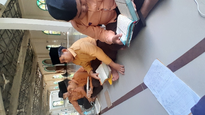 An indoor scene within a religious institution, likely a mosque or madrasah, is depicted in Lhokseumawe, Indonesia