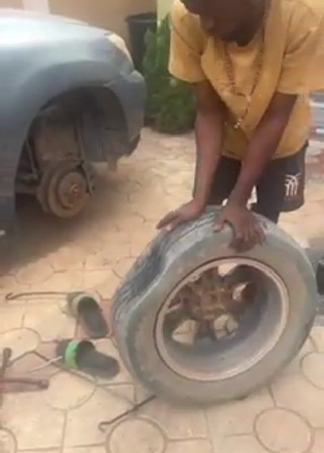 man changing a flat tire on a car parked on a paved driveway