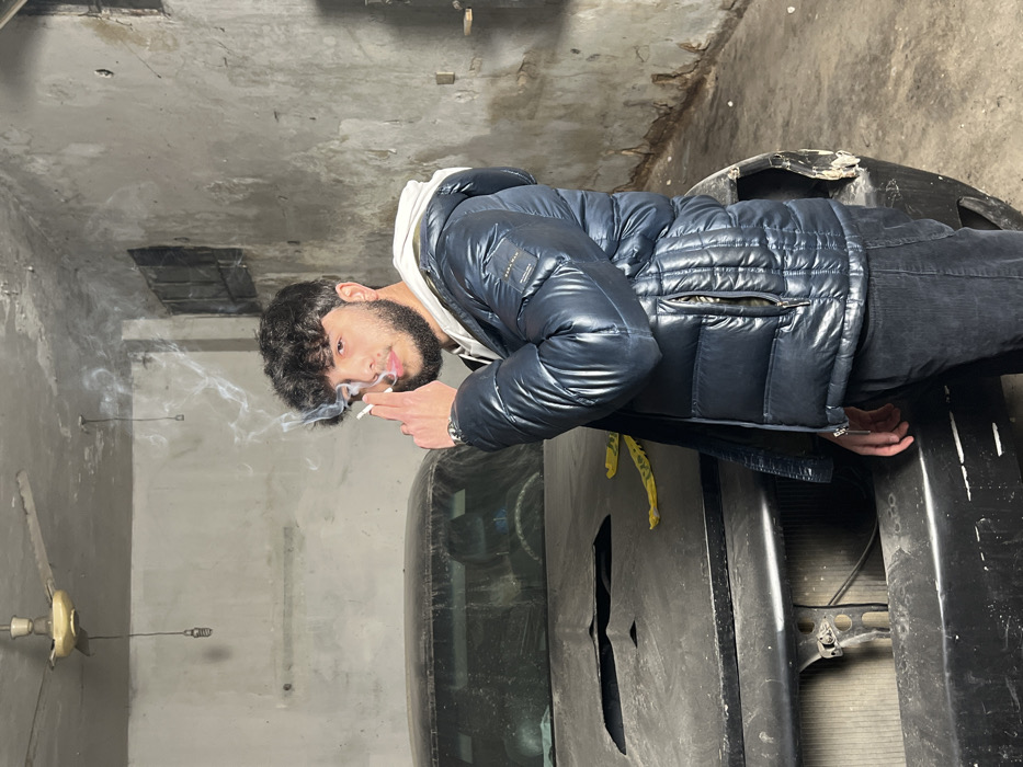 A young man with curly hair and a beard stands in what appears to be a garage, leaning on a damaged black car. He wears a shiny navy puffer jacket over a white hoodie and dark pants. Smoke curls upwards from a cigarette held in his hand. The garage has a concrete floor and walls, with a vintage-style ceiling fan. The overall atmosphere suggests a somewhat gritty or industrial setting.