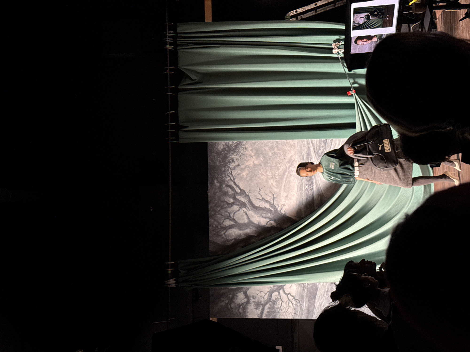 The image displays an indoor scene, likely a fashion presentation or photoshoot, occurring in Cologno Monzese, Italy. A slender individual, appearing female, with dark short hair, stands centrally on a stage. She is dressed in a dark green velvet top, a light brown midi skirt with a white belt, dark hosiery, and light-colored high-heeled shoes, holding a black PUMA duffel bag in her left hand. The background features a large painted monochrome backdrop depicting a forest with prominent tree silhouettes. Dark green fabric curtains are draped across this backdrop; the left section is gathered and pulled open, while the right section remains partially closed. The curtains are suspended from a horizontal rod. In the foreground, several individuals are visible as dark silhouettes, indicating an audience. To the right of the stage, a monitor displays a close-up portrait and a full-body shot of the model. A silver step ladder is visible against the right side of the scene. A boom arm, with a small red object at its end, extends from the right towards the stage. Two small, light-colored figures are positioned on the stage floor near the ladder. The stage area is well-lit, contrasting with the dark foreground.