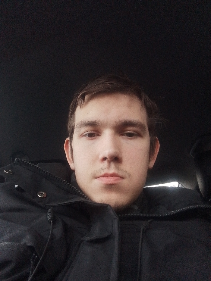 The image depicts a close-up, chest-up portrait of a single individual, a male, appearing to be in his 20s or early 30s, looking directly forward. He has short, dark brown hair, a light complexion, and a faint mustache and chin stubble. He is wearing a dark, possibly black, padded jacket or coat with a prominent central zipper, a standing collar, and visible silver-colored snap buttons on a front placket. A dark cord or drawstring is visible on the left shoulder area of the jacket. The background is uniformly dark and out of focus, suggesting an enclosed, dimly lit space, possibly the interior of a vehicle given the confined perspective. There are no discernible landmarks, architectural features, or environmental cues in the image that would allow for the identification of a specific location within the city of Saint Petersburg, Russia, or any city for that matter. The subject's expression is neutral.