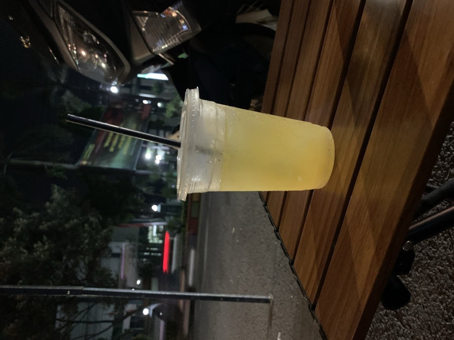 The scene depicts a street-level environment at night within the city of Kecamatan Pati, Indonesia. In the immediate foreground, a clear plastic cup containing a pale yellow, ice-filled beverage with condensation on its exterior rests on a dark brown, slatted wooden table. A black plastic straw is inserted into the drink. To the right of the cup, the front section and headlight of a dark-colored scooter or motorcycle are partially visible. The midground features an asphalt surface and a dark vertical pole on the left. The background is dark, illuminated by distant streetlights and building lights, with trees silhouetted against the night sky. A red light streak from a moving vehicle is visible on the street to the left, indicative of motion. A partially obscured green and yellow banner or sign is discernible in the distant right background. No individuals are visible in the frame.