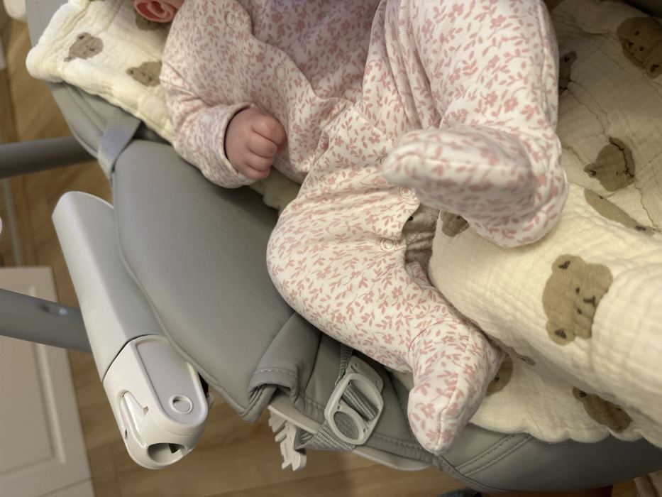 - "The image displays an infant resting in a grey padded baby bouncer or swing, positioned within an indoor residential environment" by FM-7Oxfe2, licensed under CC BY 4.0