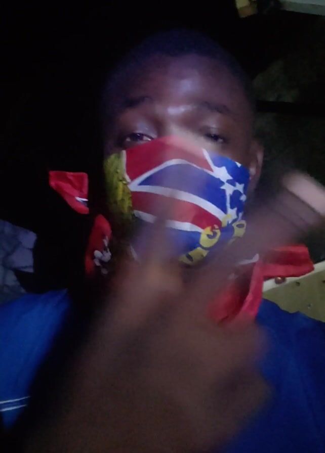 A person is wearing a blue shirt with a patterned collar and has a red and blue patterned scarf covering their mouth and nose. The background is dark. The person's eyes are visible above the scarf. The person's fingers are partially visible in the foreground.