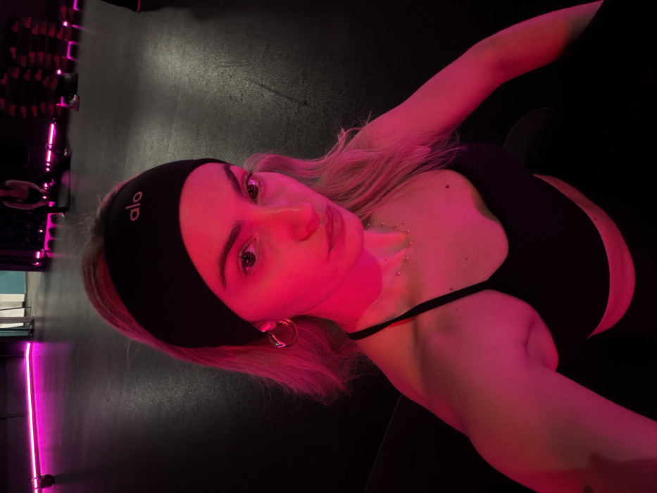 A woman in a black sports bra and headband takes a selfie in a dimly lit room with pink neon lights. Her blond hair is loose, and she wears hoop earrings. A delicate necklace adorns her neck. The setting appears to be a gym or fitness studio, with equipment visible in the background. The image is angled, showcasing her upper body and a portion of the room.