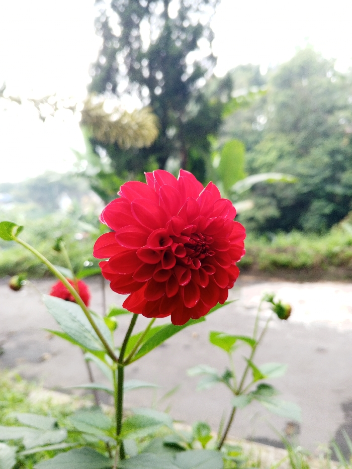 A vibrant red dahlia blooms prominently in the center, its petals densely arranged in a circular formation. Another, smaller dahlia head is visible in the background. Green stems and leaves surround the flowers, adding depth to the foreground. The background is blurred, featuring trees and a muted sky. The scene is captured outdoors, bathed in soft, natural light.