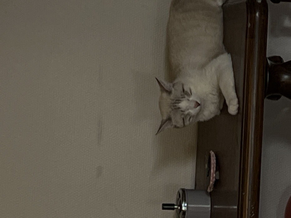 The scene is an interior room in Sarreguemines, France. A domestic cat, light beige to cream in color with visible grey point markings on its face and ears, is observed in a recumbent position on a dark brown, polished wooden table. Its eyes are closed. To the cat's left, on the same table surface, a cylindrical metallic ashtray with a black central element is positioned adjacent to a small, flattened pink object. The background consists of a plain, light-colored wall.