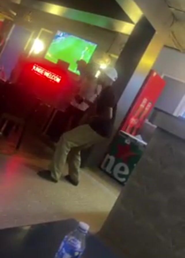 n indoor setting, possibly a lounge or bar, with a man standing and gesturing near a brightly lit DJ booth. The booth has a red light display that reads "LOUNGE WELCO" or "LOUNGE WELCOME TO." The man is wearing a dark shirt, khaki pants, a white baseball cap, and dark shoes. He is facing towards a television screen displaying a soccer match. Another person is partially visible behind the man, also watching the screen. To the right of the man is a refrigerator with Coca-Cola and Heineken branding. A bottle of water is on a table in the foreground. The overall lighting is dim with bright light sources.