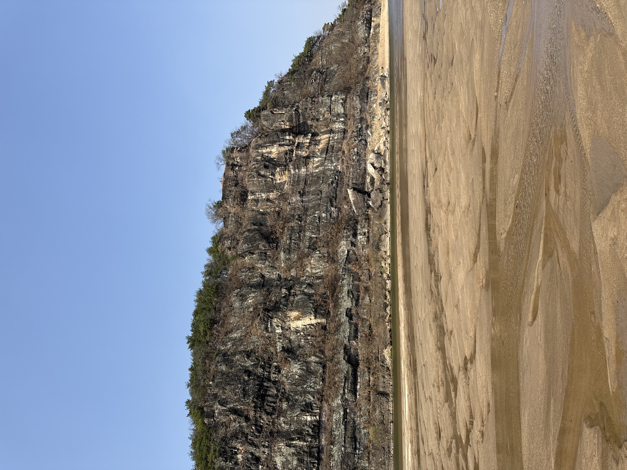 The image depicts a panoramic view of a natural landscape in Andong-si, South Korea, likely the Buyongdae Cliff area along the Nakdong River. The scene is dominated by a clear, light blue sky occupying the upper third of the frame, devoid of clouds. Below the sky, a large, stratified rock cliff face extends across the mid-ground. The cliff exhibits dark grey and brown rock layers with lighter beige and grey striations, particularly noticeable on its vertical surfaces. Sparse vegetation, primarily dark green evergreen trees (pines) and some bare deciduous trees and bushes, tops the cliff and clings to its ledges. At the base of the cliff, a narrow body of murky, greenish-brown water, presumably a river, runs horizontally across the scene. Adjacent to the water in the foreground, extensive golden-brown sand flats are visible, displaying intricate ripple patterns and shallow pools of standing water, indicating either a low river level or tidal exposure. No individuals, animals, or man-made objects are present or engaged in any discernible actions or interactions within the frame. The overall environment appears natural and undisturbed.