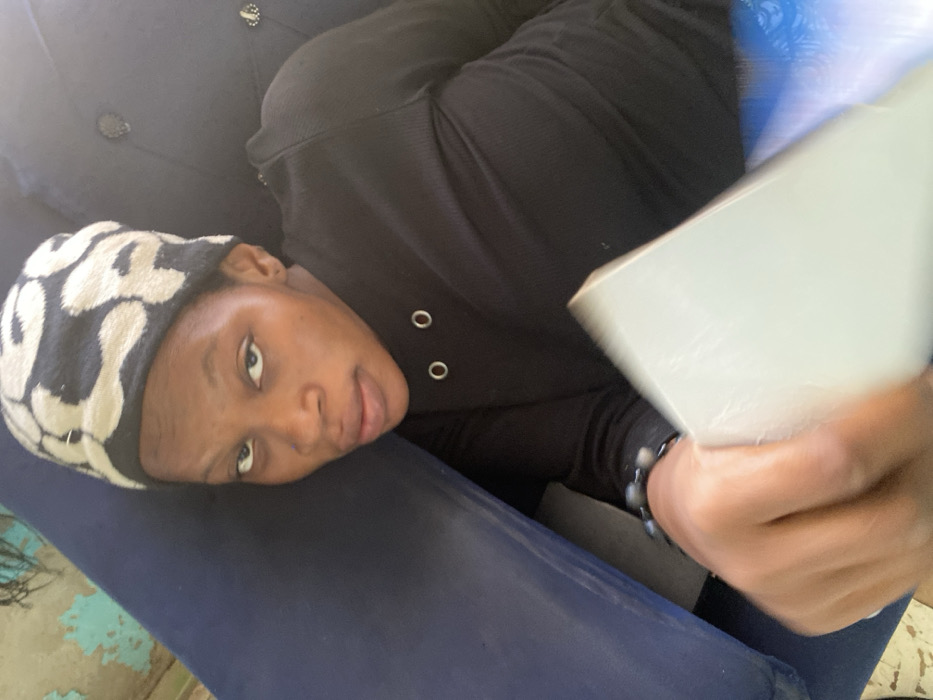 Within an indoor setting in Minna, Nigeria, an adult female is depicted in a close-up, head-and-shoulders composition, reclining against a dark blue upholstered surface, likely a sofa or chair. The individual, possessing dark skin, wears a black and light-patterned beanie and a long-sleeved black top featuring two metallic eyelets on the neckline. Her left wrist displays a dark, beaded bracelet. She gazes directly into the camera with a neutral expression. In her left hand, extended towards the foreground, she holds a light-colored, rectangular object, possibly a book or tablet, partially visible. The upholstered surface behind her exhibits visible tufting or button details. To the left of the subject, a wall with light blue paint shows areas of wear and lighter, possibly peeling, patches.
