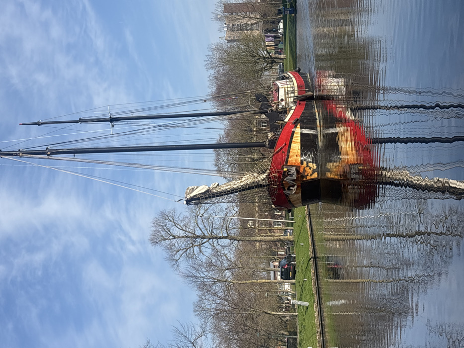- "A two-masted sailing ship, painted red along its upper hull, transitioning to weathered yellow-orange, and black at the waterline, is positioned on a calm canal in Leeuwarden, Netherlands" by FM-ms2yw2, licensed under CC BY 4.0