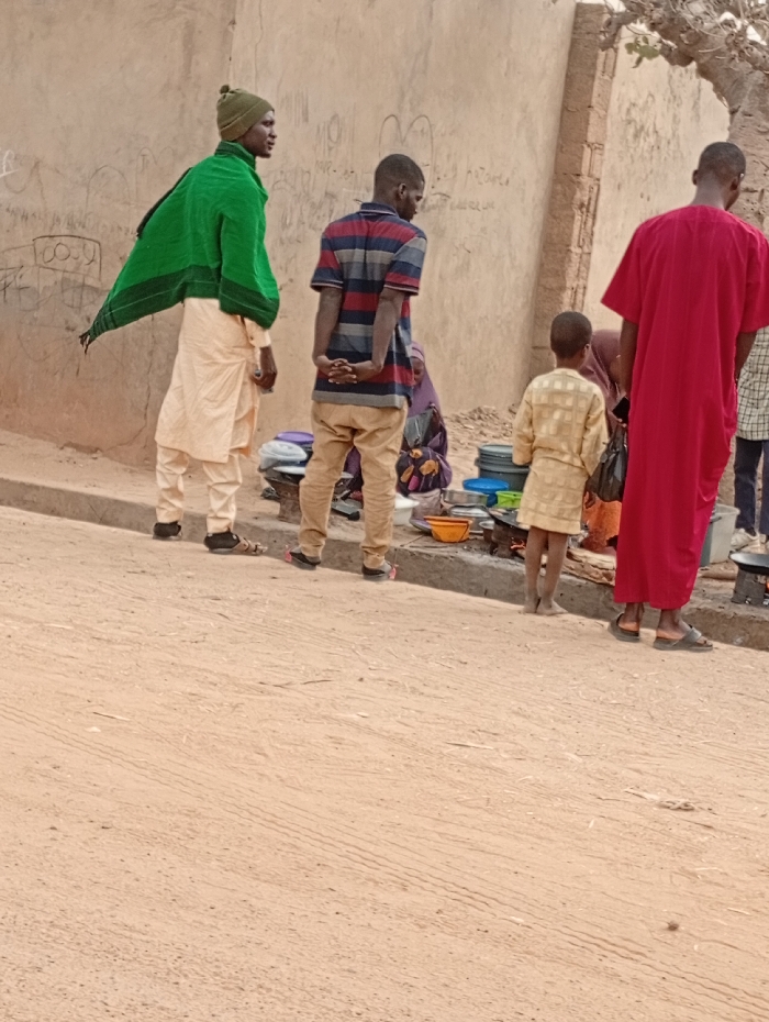 Five individuals stand near a vendor or food preparation area. One man wears a green shawl and a tan outfit. Another man wears a striped shirt and khaki pants, with his hands behind his back. A child wears a yellow patterned outfit. A fourth person wears a long red robe. Dishes, pots, and what appears to be a cooking stove are visible. The scene is set outdoors on a dirt or sandy area, with a light-colored wall in the background.