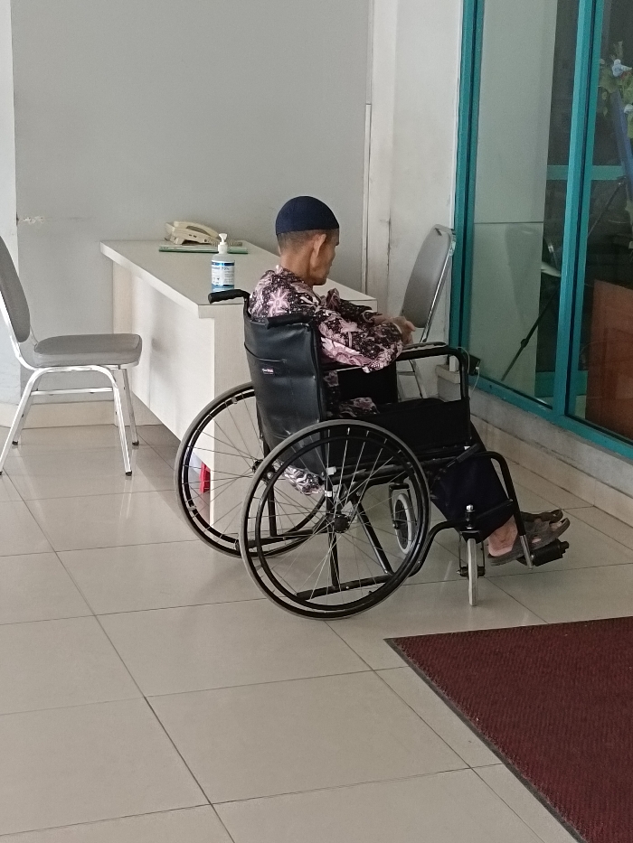 An individual is seated in a black manual wheelchair, positioned indoors against a light-colored wall, in a facility located in Margorejo, Indonesia