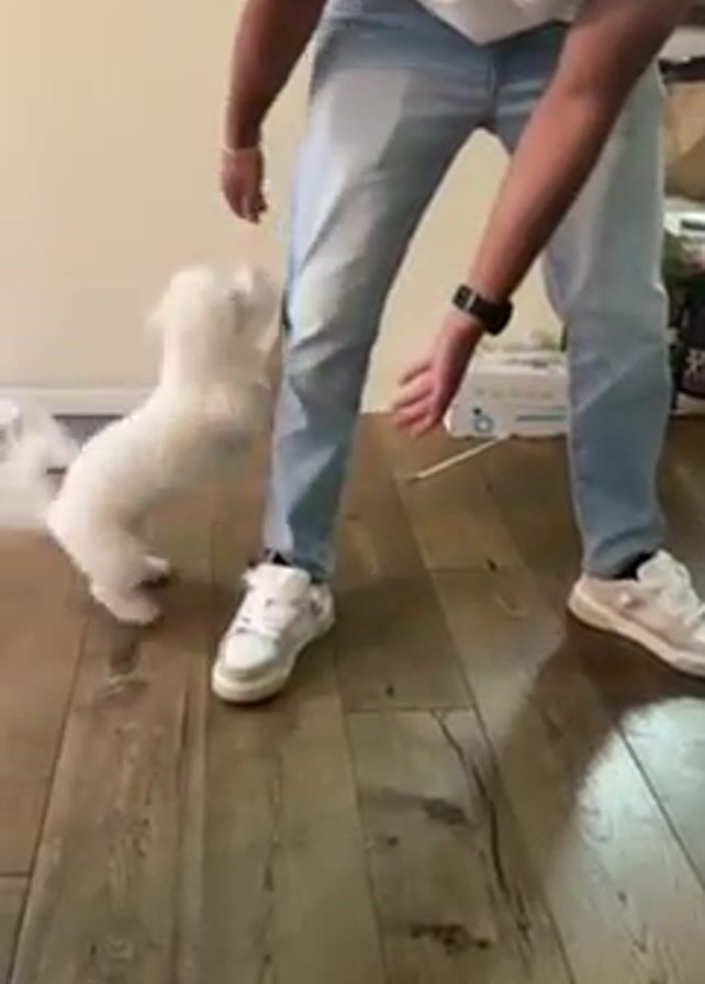 man playing with a small white dog on a wooden floor